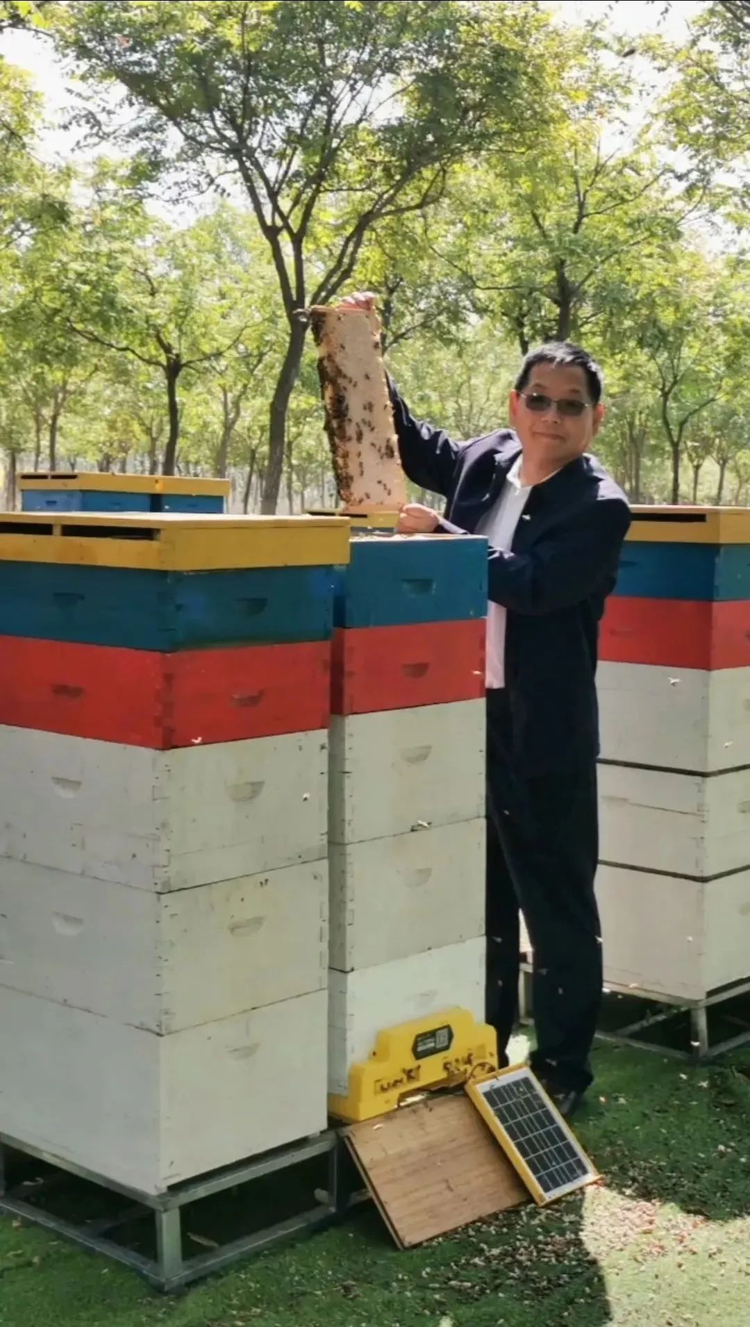 自4月初起,中國蜂產品協(xié)會副會長、國家優(yōu)質蜂產品科技創(chuàng)新聯盟副理事長,全國蜂產業(yè)標準化工作組副組長,劉富海研究員多次至蘇峪口養(yǎng)蜂實驗基地,進行現場指導。在蜂群換箱、周邊蜜源、蜜蜂除螨等方面提出建議指導,為保證蜂蜜產量及蜜蜂數量,劉富海研究員強調在周邊蜜源開花期不可打藥。養(yǎng)蜂實驗基地采用人工與智能共同管理,場地安裝攝像監(jiān)控,遠程觀看蜂箱情況。使用智能蜂箱,對濕度、溫度、重量等參數,通過手機APP進行精準監(jiān)控觀察。